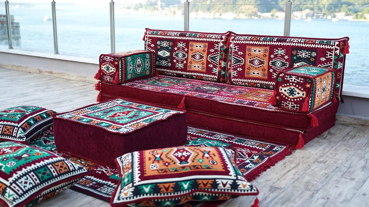 You will receive products in the variant you selected from the listing page. This sofa set comes in 10 separate pieces. If you choose 'Sofa Full Set / 4'' Thickness' you will get these: -1 Floor Seating Cushion (190 x 70 x 10 cm / 75 x 27 x 4 inch) -2 Backrest Pillows (90 x 40 x 10 cm / 35 x 16 x 4 inch) -2 Armrest Pillows (50 x 20 x 20 cm / 20 x 8 x 8 inch) -1 Matching Rug (120cm x 180cm / 47 x 71 inch) -1 Ottoman Couch (60 x 60 x 20 cm / 23 x 23 x 8 inch) -3 Pouff Pillows (70 x 50 / 27 x 20 inch) * The floor sofas are not freestanding, they need to lean against a wall or something hard behind * We can customize this product upon your request * All covers include their foam filling inserts * All covers are zippered * Beautiful texture and soft to touch * Comfortable to sit or sleep on * Top-quality finish and workmanship * Excellent for homes, offices, hotels, cafeterias, etc. * Machine washable